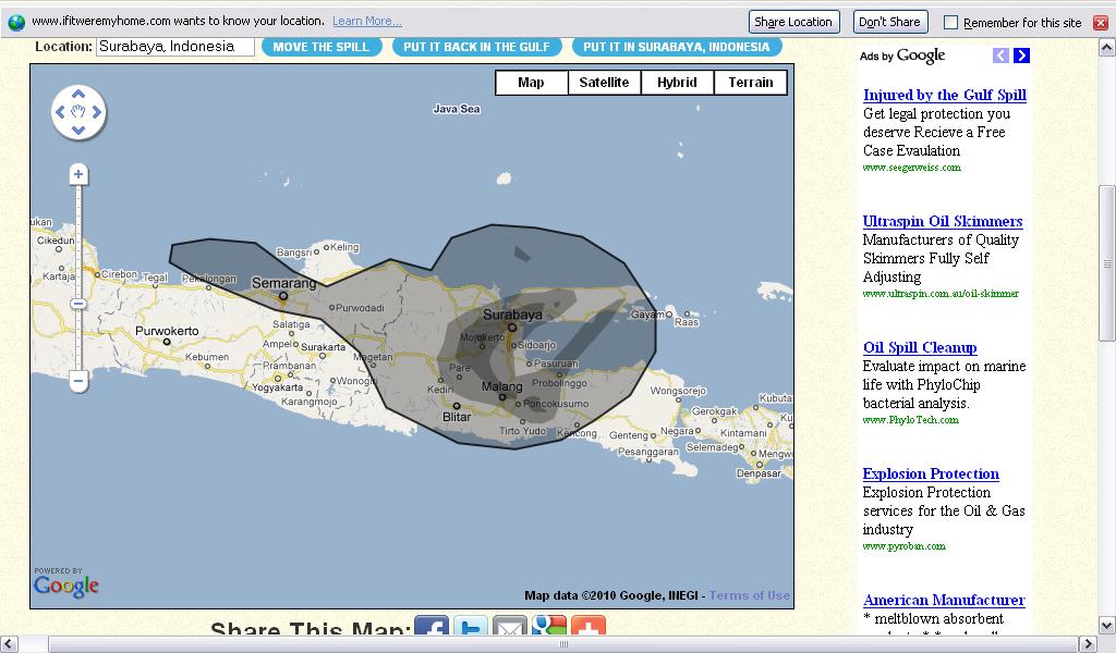 Surabaya, misalnya, lalu klik “move the spill” dan lihatlah hasilnya. Ternyata tumpahan minyak British Petroleum di Teluk Meksiko itu bisa menutup hampir seluruh provinsi Jawa Timur dan bahkan se-Kabupaten Mimika!