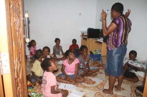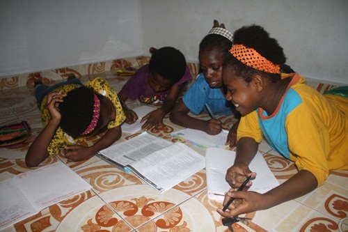 Dialog sederhana semacam itu yang kerap mengawali bergabungnya seorang anak di bimbingan belajar (Bimbel) Papua Anigou yang berlokasi di daerah Jalan Baru, Timika. Pesertanya cukup beragam, mulai dari anak-anak asli Mimika hingga anak-anak pendatang dari area Jalan Baru. Mulai dari yang sekolah hingga yang putus sekolah. Kebanyakan anak-anak usia Sekolah Dasar.