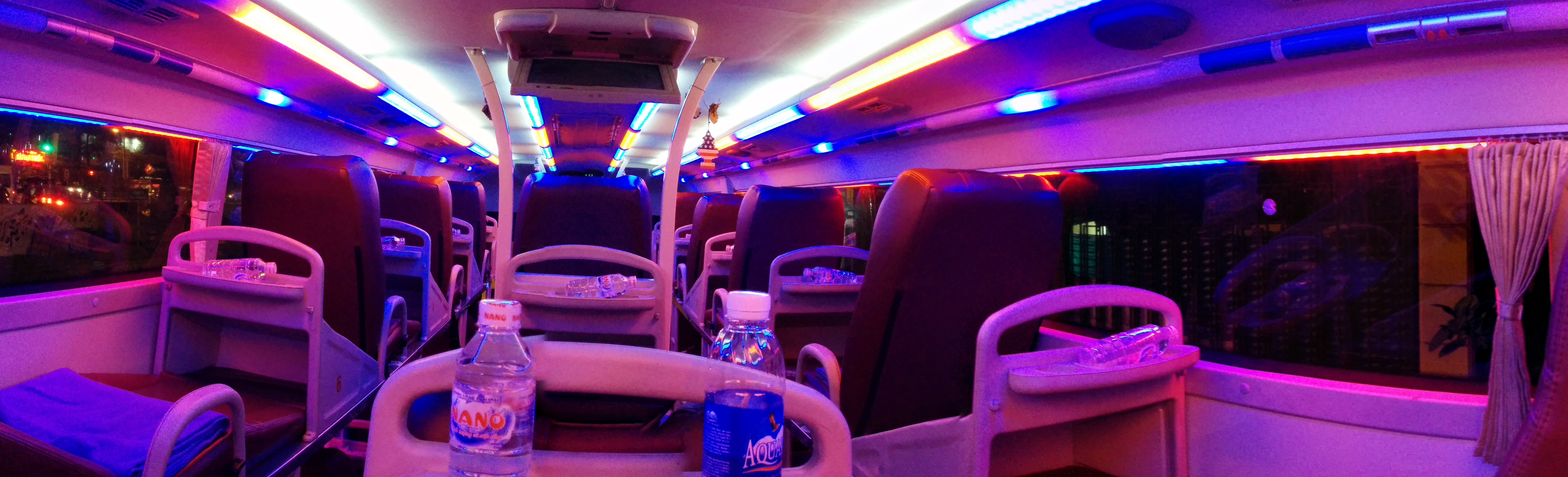 Beberapa hari sebelum Sasi dan aku memutuskan naik bus yang memakan waktu 16 jam ini, aku agak ragu dengan kemampuan Sasi menghadapi suasana bus dan perjalanan yang melelahkan. Dia memutuskan mau naik bus karena kata Toan (sambil menunjukkan foto-foto hasil Googling), kursinya bisa ditekuk jadi tempat tidur, AC dan Wifi mengalir lancar.