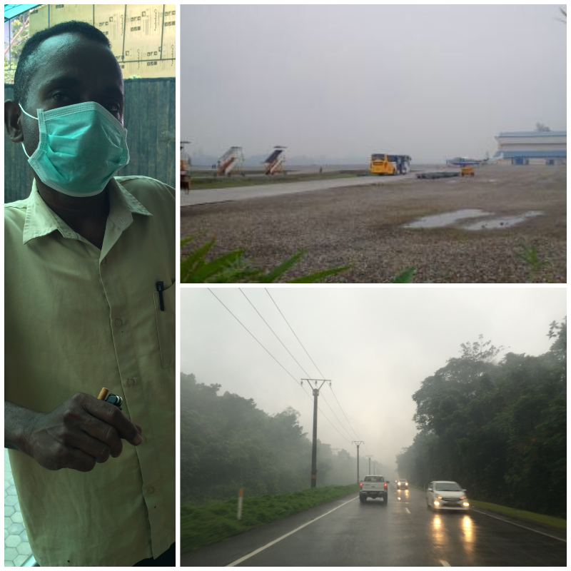 Searah jarum jam: Rudi Wantik, warga Timika (Jumat, 16 Oktober 2015), dengan maskernya, Suasana Bandara Mozes Kilangin Timika, Kuala Kencana. (Minggu 18 Oktober 2015)